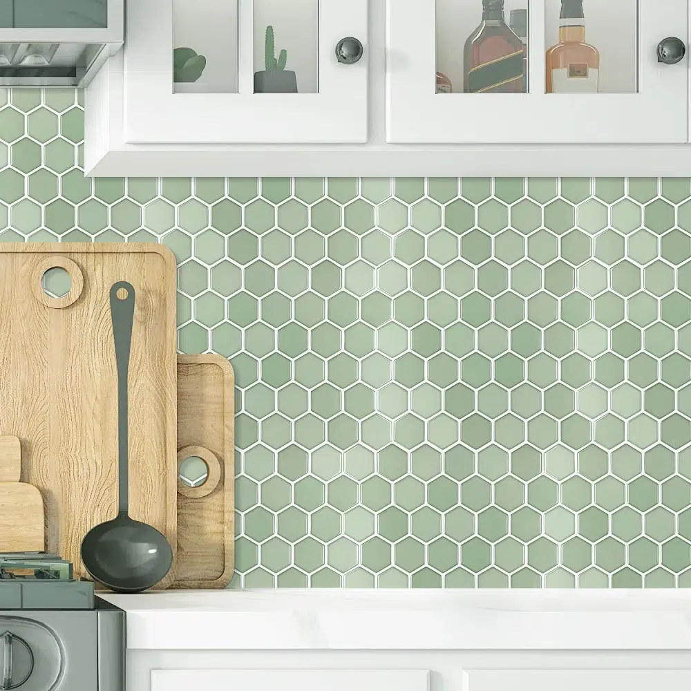 Azulejo adhesivo hexagonal en tono verde salvia con juntas blancas definidas y acabado suave.