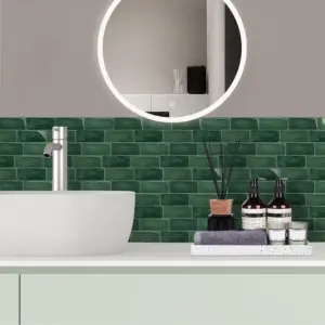 Azulejo adhesivo estilo metro en verde esmeralda con efecto esmaltado y acabado brillante.